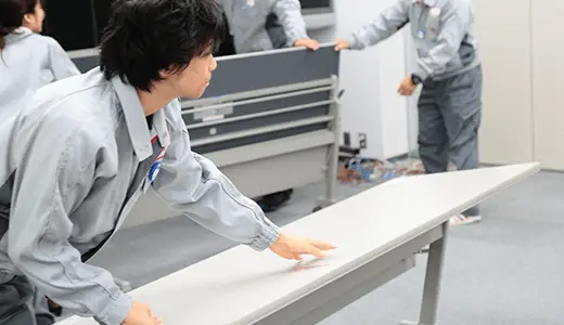 オフィスレイアウト変更・オフィス家具(デスク・キャビネット等)の室内での配置換え・ダンボール(書類・小物等)の室内移動・オフィス家具(キャビネット等)の連結(切り離し)および耐震対策 ※電話・LAN工事は含まず。
